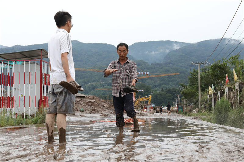 8月18日下午,在草壩青衣江大橋建設(shè)現(xiàn)場,項(xiàng)目部外的院壩、工地附近的道路,均覆蓋著厚厚的淤泥!白蛲砭o急撤離,我的車停在河邊,也沒來得及開走,現(xiàn)在都沒找到!币荒樒v的李勁松告訴記者,雖然洪水漲勢迅猛,但他們撤離之前,提前通知了電力部門斷電,否則若有人再次靠近洪水,將面臨觸電的風(fēng)險。