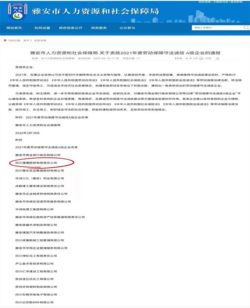 近日,根據(jù)《雅安市人力資源和社會保障局關(guān)于表揚(yáng)2021年度勞動保障守法誠信 A級企業(yè)的通報(bào)》,雅安交通建設(shè)(集團(tuán))有限責(zé)任公司下屬四川康藏路橋有限責(zé)任公司榮獲2021年度勞動保障守法誠信 A級企業(yè),名列我市“誠信紅榜”。