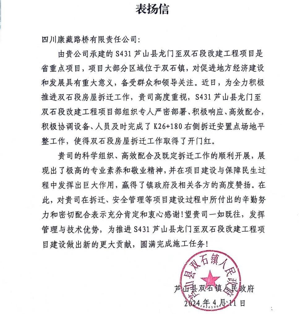 近日,雅安交建集團四川康藏路橋有限責任公司收到來自蘆山縣雙石鎮(zhèn)人民政府的表揚信。信中對S431蘆山縣龍門至雙石段改建工程項目部積極協(xié)調(diào)設備、人員配合當?shù)卣瓿蒏26+180右側拆遷安置點場地平整工作,使得雙石段房屋拆遷工作取得了開門紅給予了高度評價和贊揚。