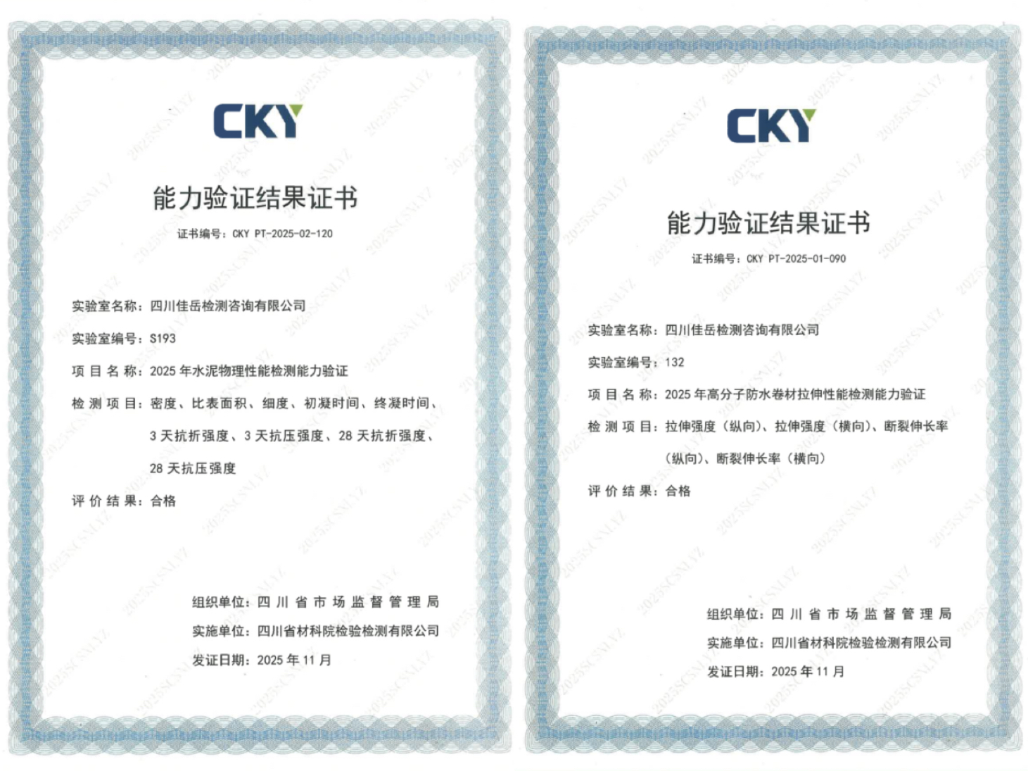 近日,佳岳公司順利完成2025年度檢測能力驗(yàn)證工作,“高分子防水卷材拉伸性能檢測”與“水泥物理性能檢測”兩項(xiàng)項(xiàng)目結(jié)果均獲“滿意”評(píng)價(jià)。