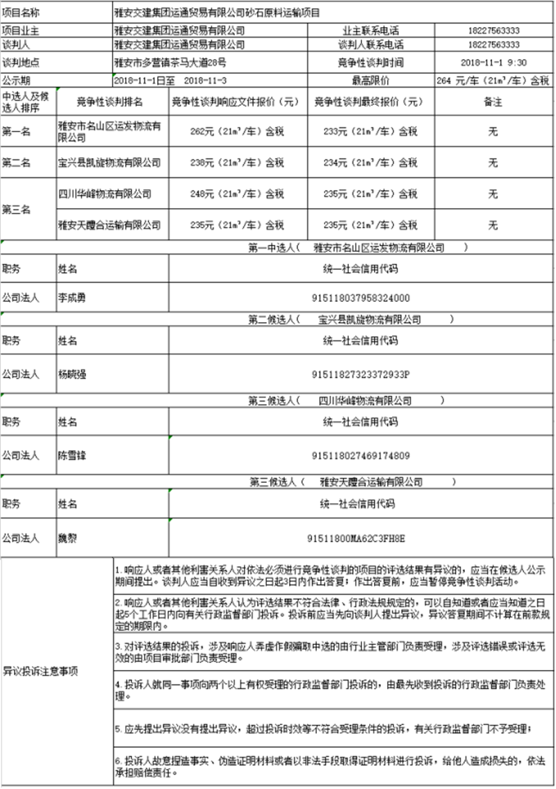 雅安交建集團運通貿易有限公司砂石原料運輸項目競爭性談判中選人及候選人公示