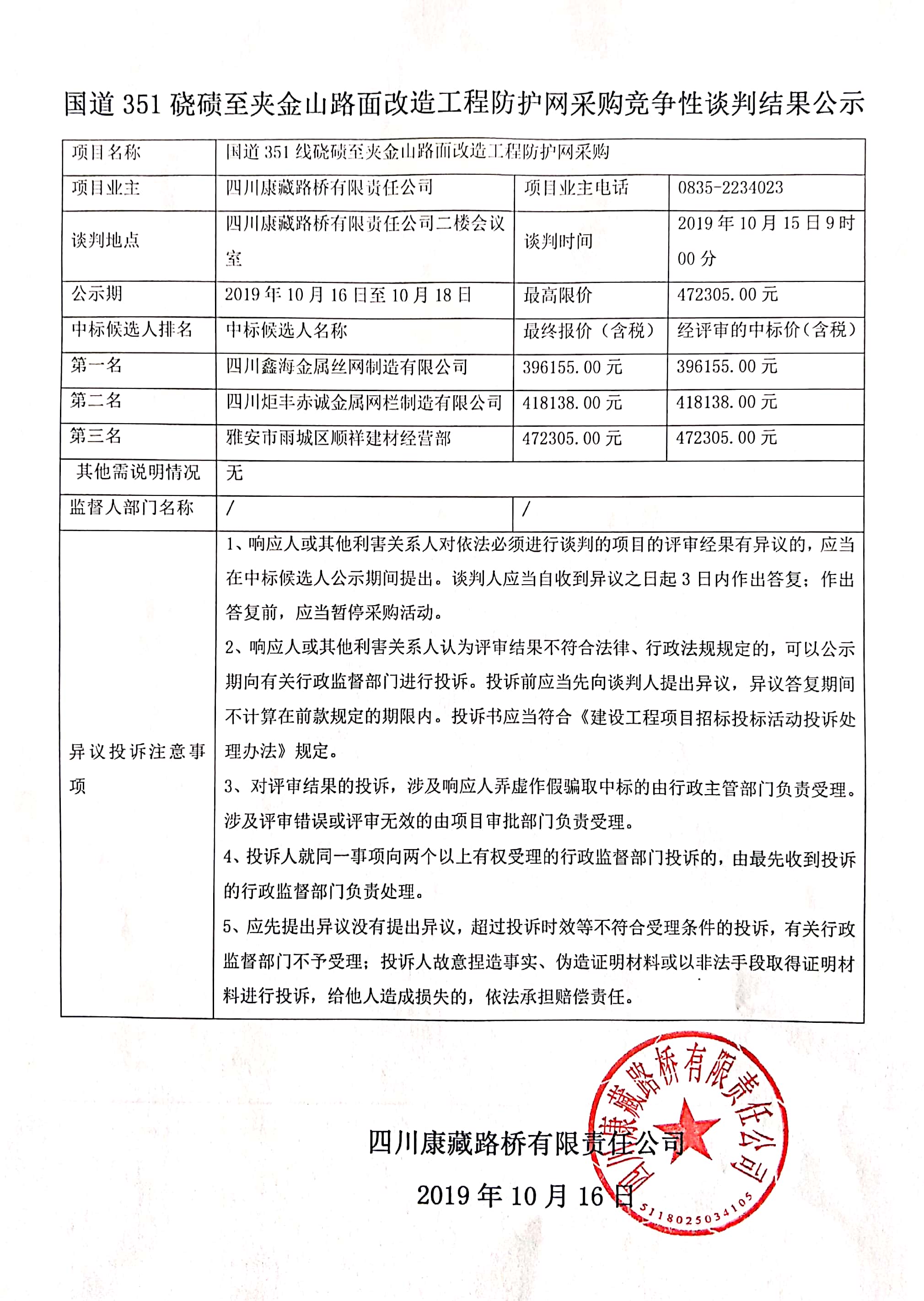 四川康藏路橋有限責任公司國道351磽磧至夾金山路面改造工程防護網(wǎng)采購競爭性談判結(jié)果公示