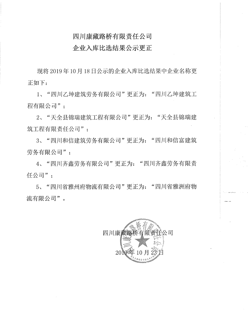 四川康藏路橋有限責(zé)任公司企業(yè)入庫比選結(jié)果公示更正