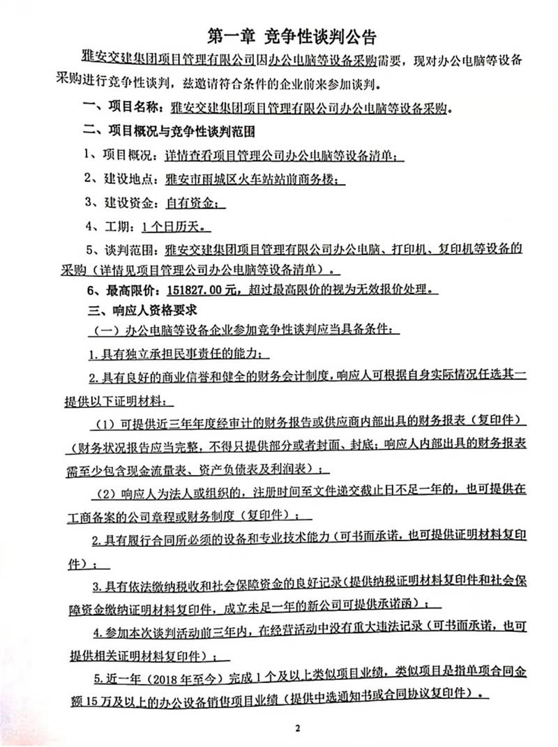 雅安交建集團項目管理有限公司辦公電腦等設(shè)備采購競爭性談判公告