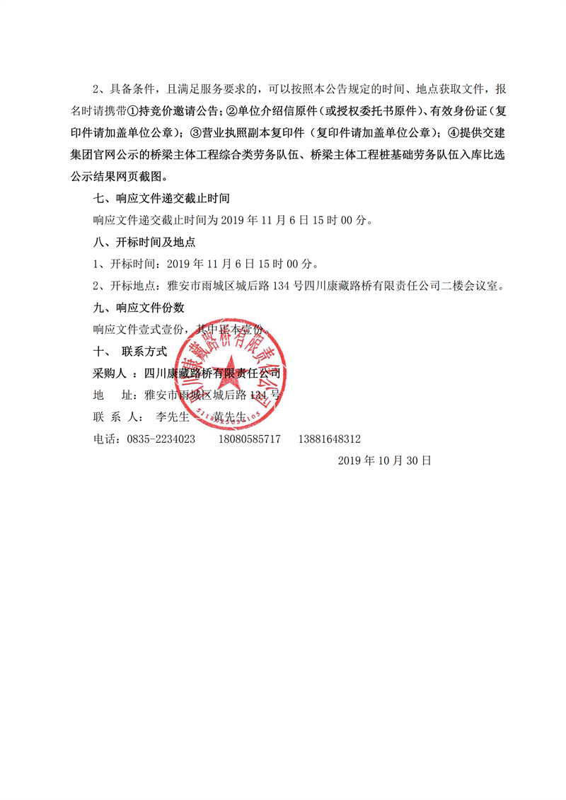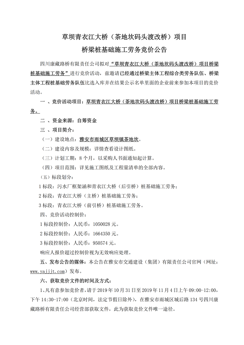 四川康藏路橋有限責(zé)任公司草壩青衣江大橋(茶地坎碼頭渡改橋)項目橋梁樁基礎(chǔ)施工勞務(wù)競價公告