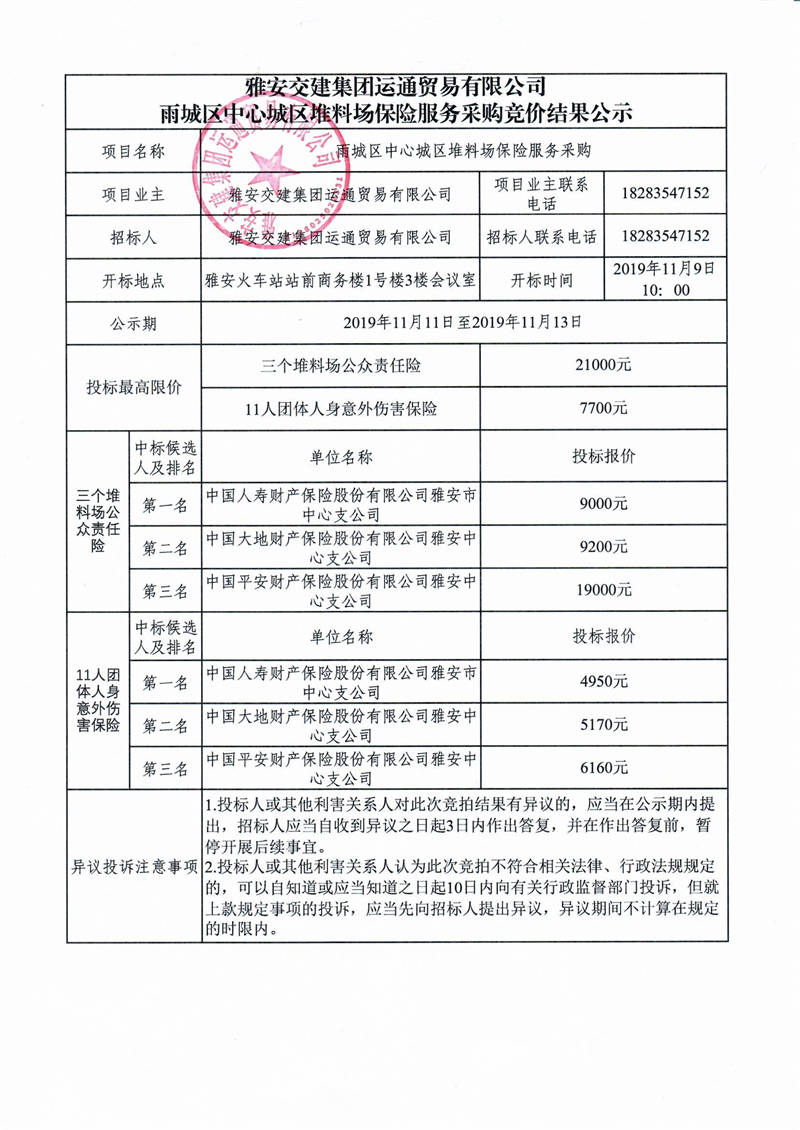 雅安交建集團(tuán)運(yùn)通貿(mào)易有限公司雨城區(qū)中心城區(qū)堆料場保險(xiǎn)服務(wù)采購競價(jià)結(jié)果公示