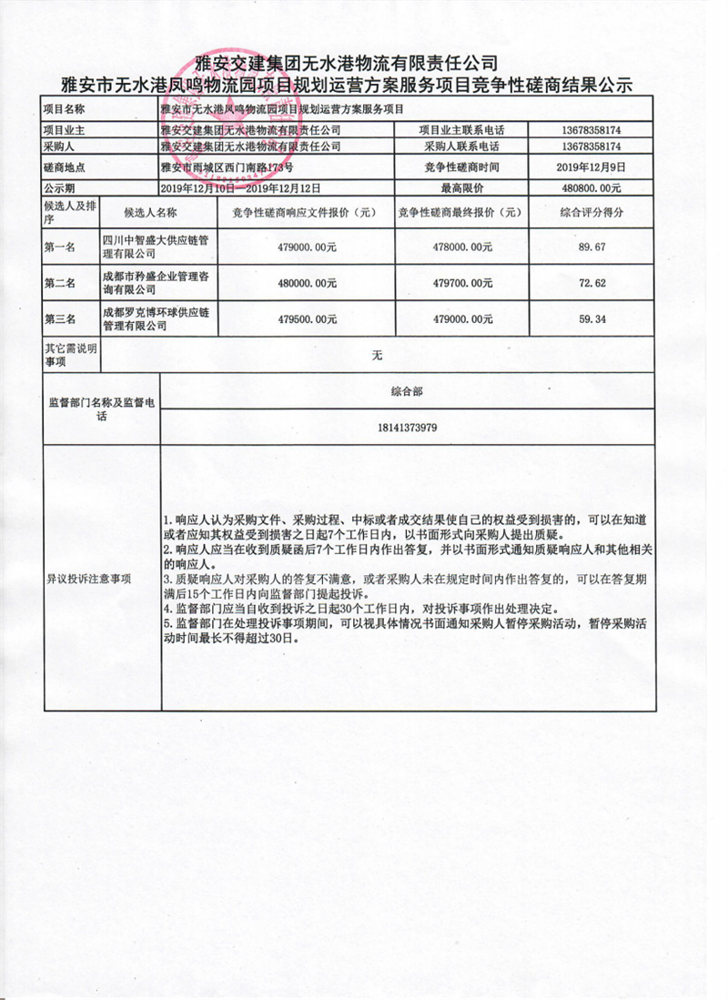 雅安交建集團無水港物流有限責任公司雅安市無水港鳳鳴物流園項目規(guī)劃運營方案服務項目競爭性磋商結(jié)果公示