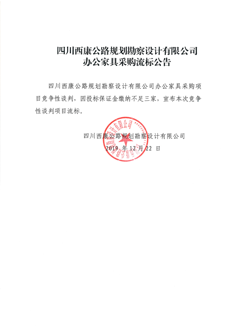 四川西康公路規(guī)劃勘察設(shè)計有限公司辦公家具采購流標(biāo)公告