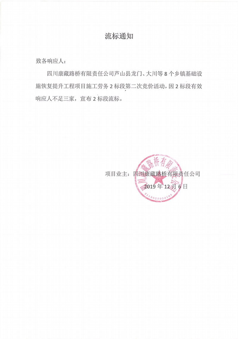四川康藏路橋有限責(zé)任公司蘆山縣龍門、大川等8個鄉(xiāng)鎮(zhèn)基礎(chǔ)設(shè)施恢復(fù)提升工程項(xiàng)目施工勞務(wù)2標(biāo)段第二次競價流標(biāo)通知