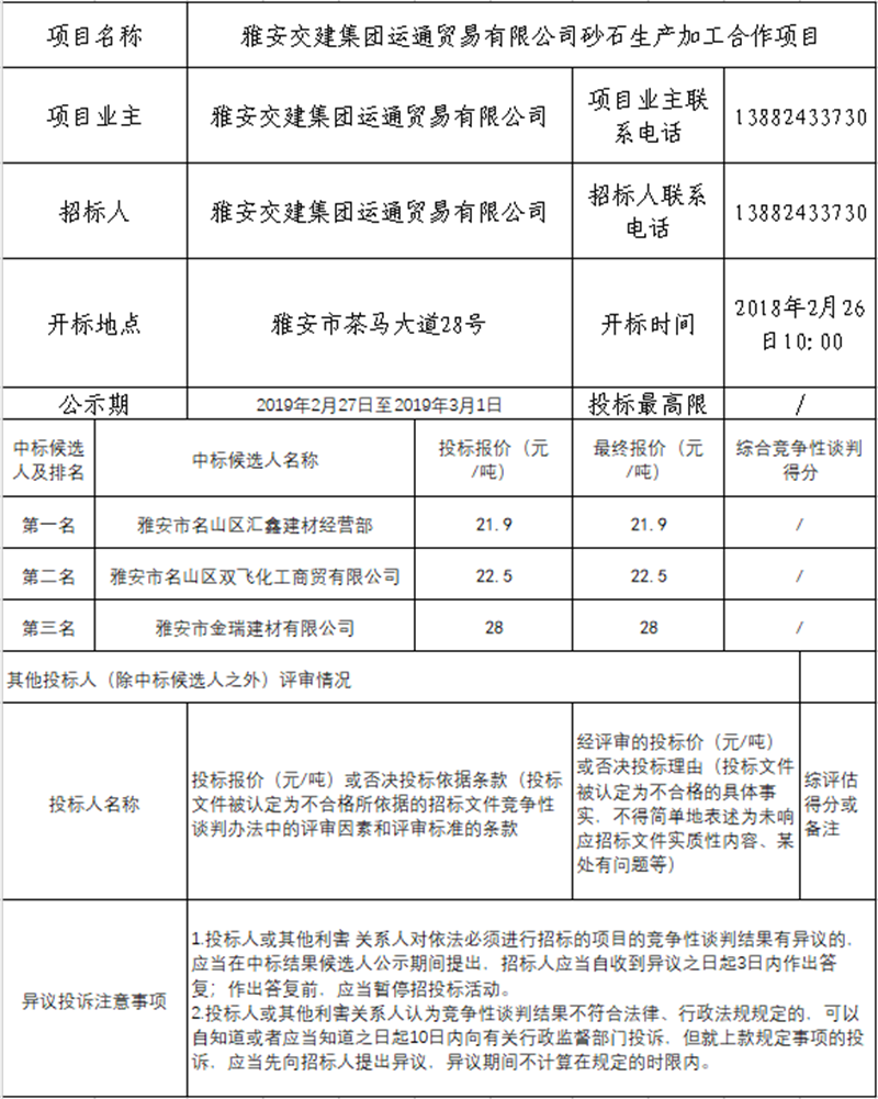 雅安交建集團運通貿(mào)易有限公司砂石生產(chǎn)加工合作項目競爭性談判結(jié)果公示