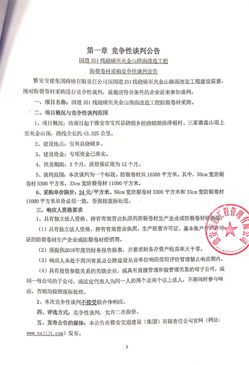 雅安交建集團路橋有限責(zé)任公司國道351線磽磧至夾金山路面改造工程防裂卷材采購競爭性談判公告
