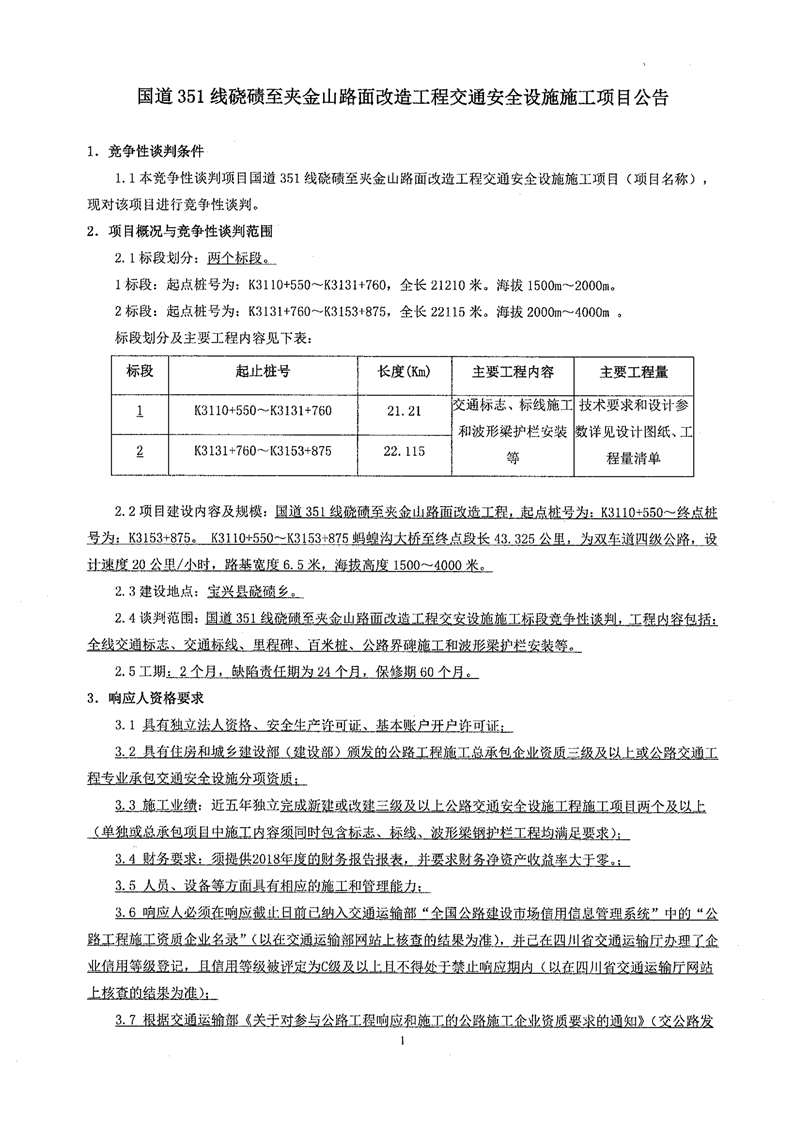 雅安交建集團(tuán)路橋有限責(zé)任公司國道351線磽磧至夾金山段路面改造工程交通安全設(shè)施施工項(xiàng)目競爭性談判公告