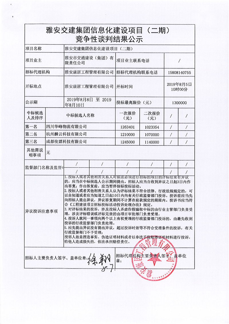 雅安交建集團(tuán)信息化建設(shè)項目(二期)競爭性談判結(jié)果公示