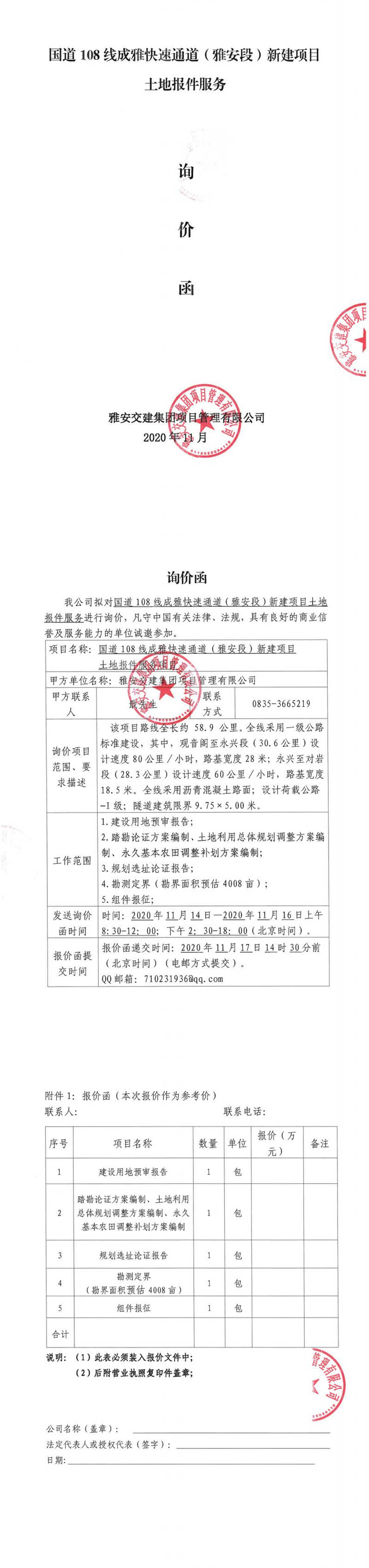 雅安交建集團項目管理有限公司國道108線成雅快速通道(雅安段)新建項目土地報件服務項目詢價函