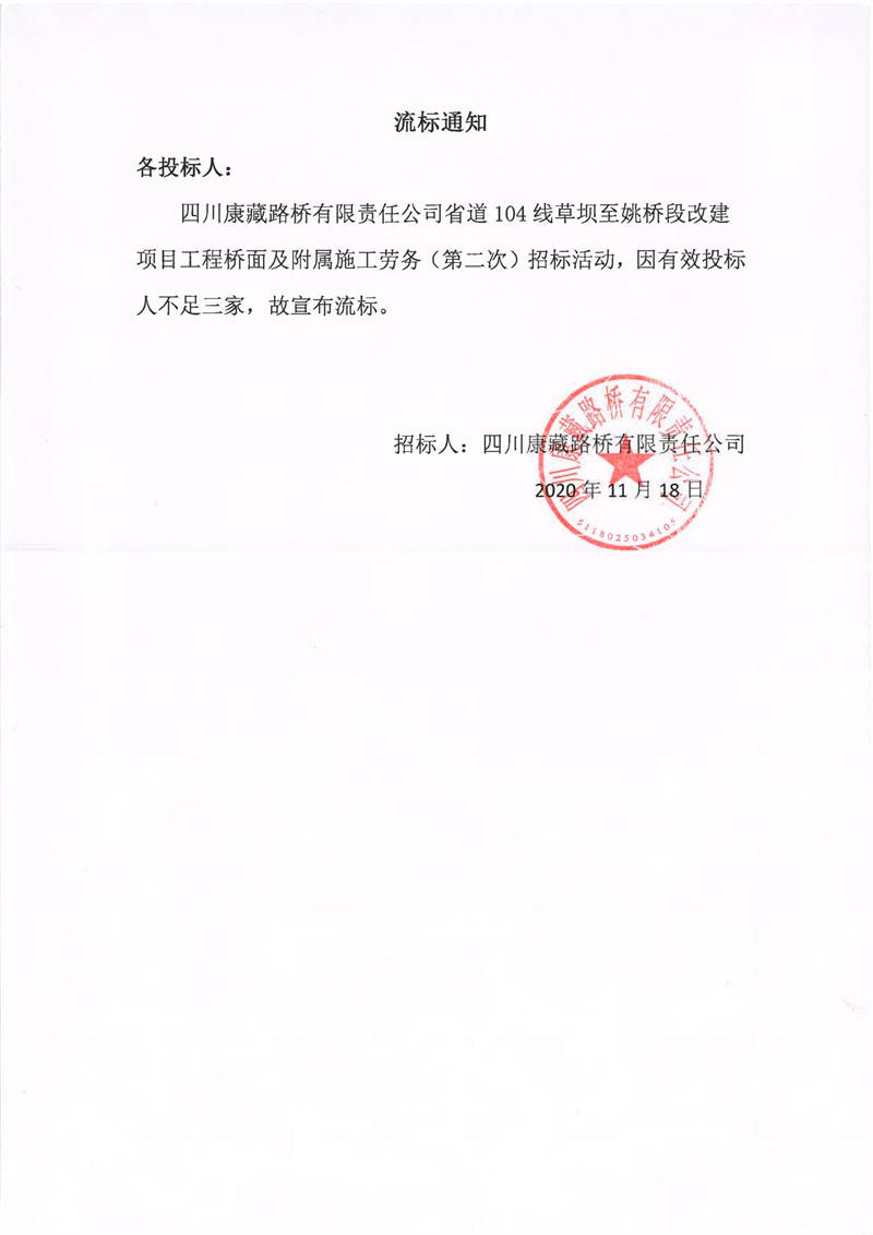 四川康藏路橋有限責(zé)任公司省道104線草壩至姚橋段改建項目工程橋面及附屬施工勞務(wù)(第二次)流標通知