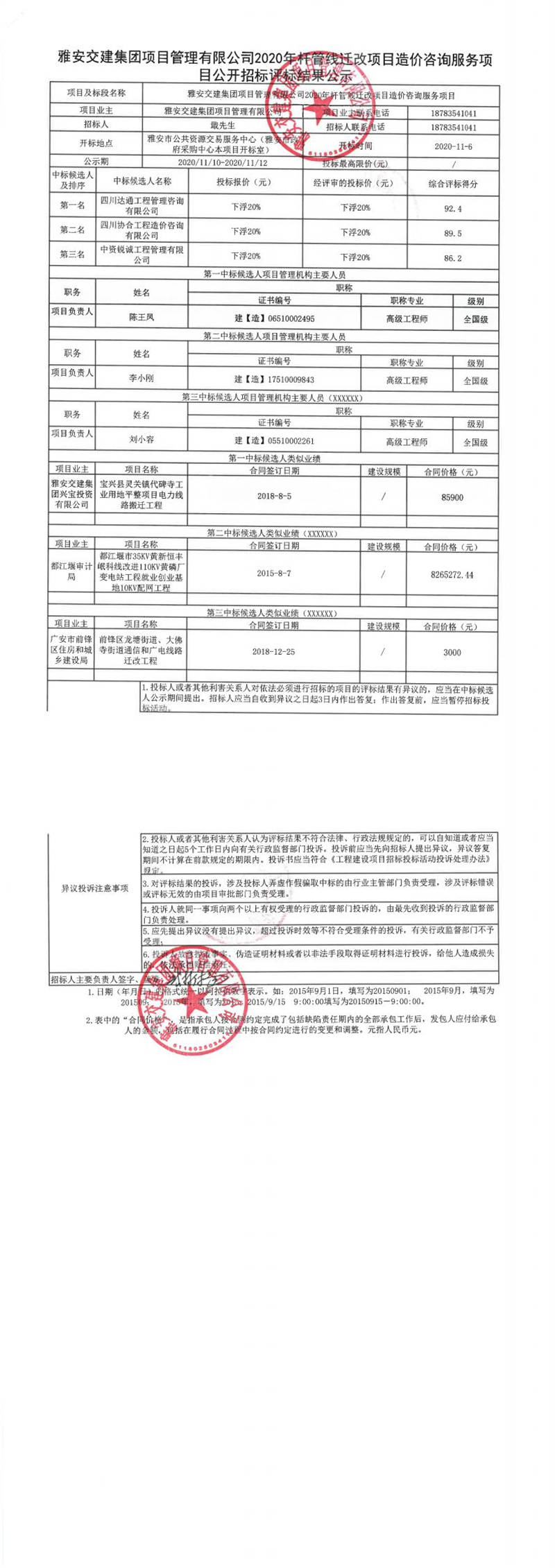 雅安交建集團(tuán)項(xiàng)目管理有限公司2020年桿管線遷改項(xiàng)目造價咨詢服務(wù)項(xiàng)目公開招標(biāo)評標(biāo)結(jié)果公示