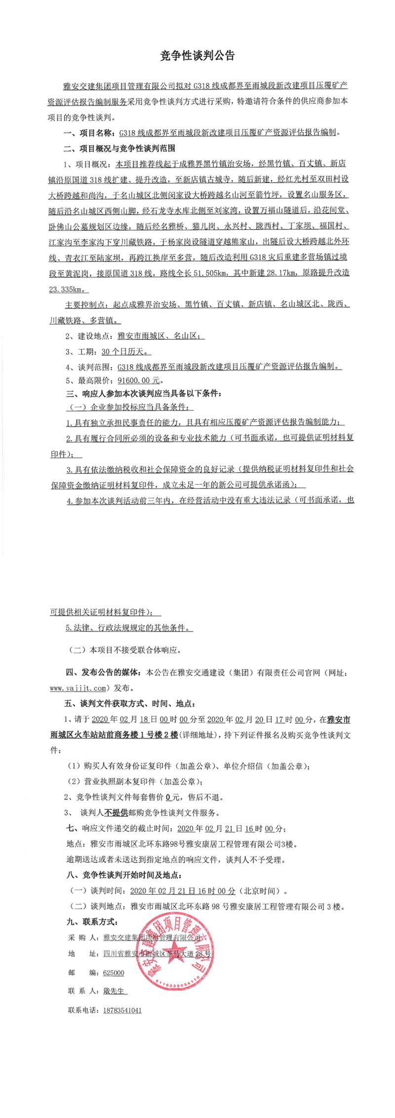 雅安交建集團(tuán)項(xiàng)目管理有限公司G318線成都界至雨城段新改建項(xiàng)目壓覆礦產(chǎn)資源評估報(bào)告編制競爭性談判公告