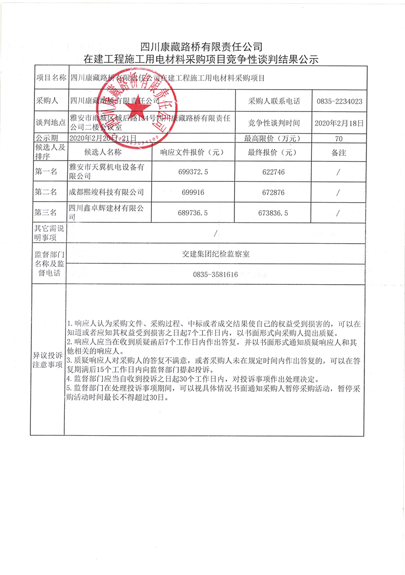 四川康藏路橋有限責任公司在建工程施工用電材料采購項目競爭性談判結(jié)果公示