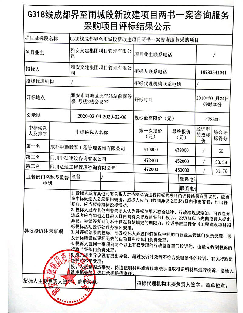 雅安交建集團(tuán)項(xiàng)目管理有限公司G318線成都界至雨城段新改建項(xiàng)目?jī)蓵?shū)一案咨詢(xún)服務(wù)采購(gòu)項(xiàng)目評(píng)標(biāo)結(jié)果公示