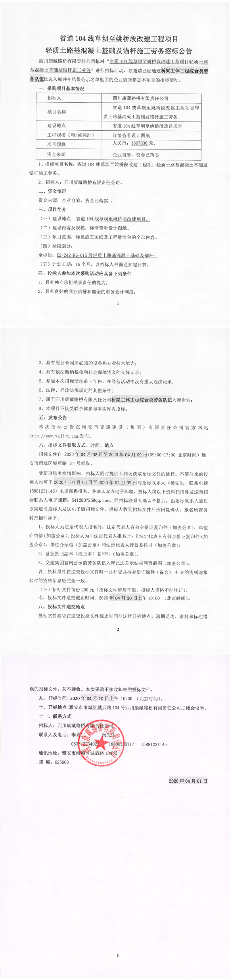四川康藏路橋有限責(zé)任公司省道104線(xiàn)草壩至姚橋段改建工程項(xiàng)目輕質(zhì)土路基混凝土基礎(chǔ)及錨桿施工勞務(wù)招標(biāo)公告