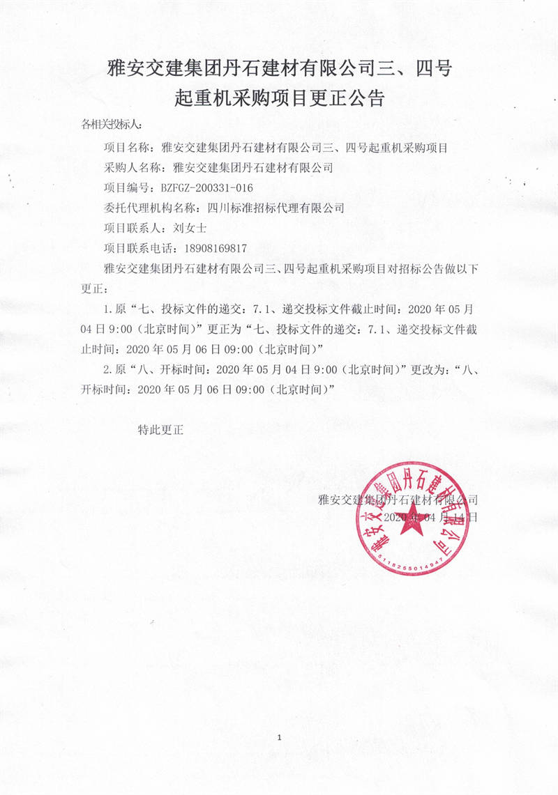 雅安交建集團(tuán)丹石建材有限公司三、四號起重機(jī)采購項目更正公告