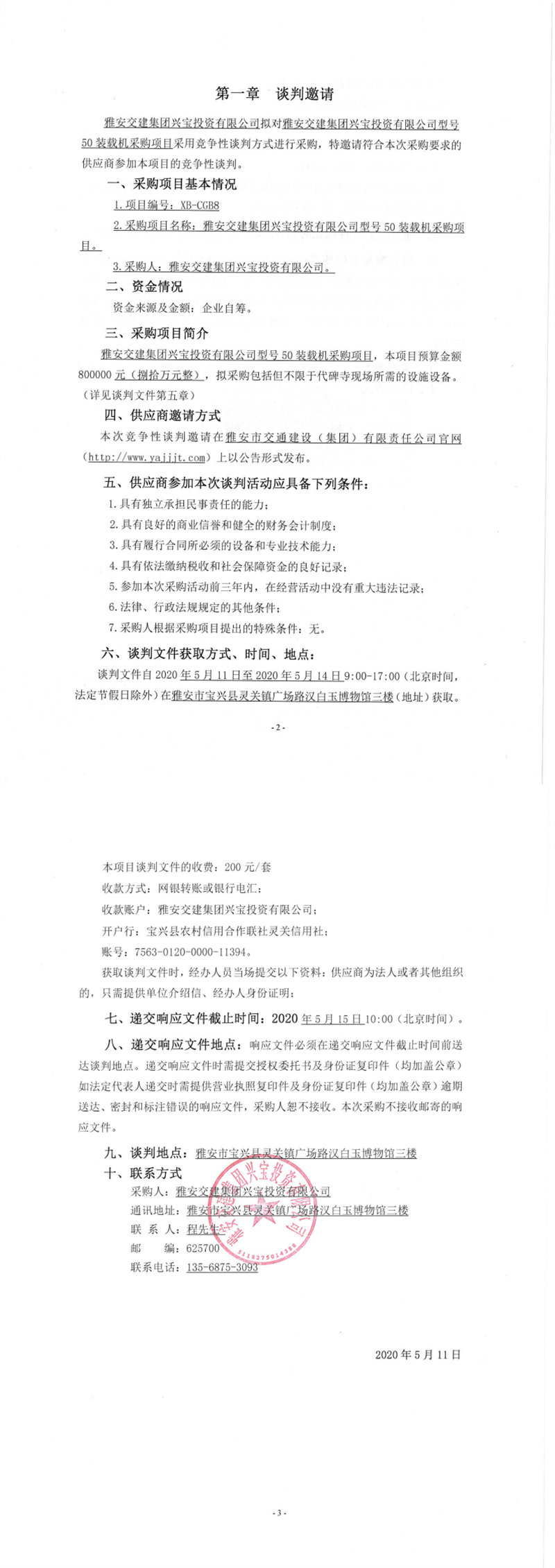 雅安交建集團(tuán)興寶投資有限公司型號(hào)50裝載機(jī)采購項(xiàng)目競爭性談判公告