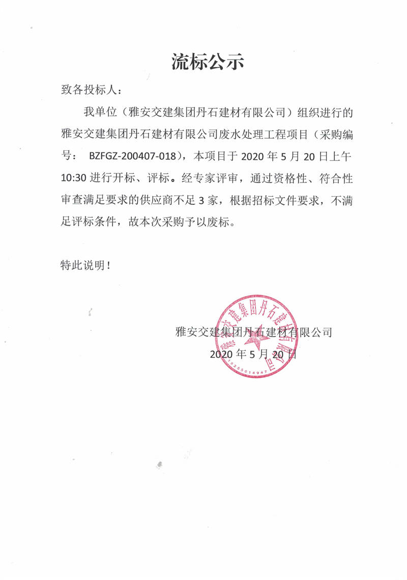 雅安交建集團丹石建材有限公司廢水處理工程項目流標(biāo)公示