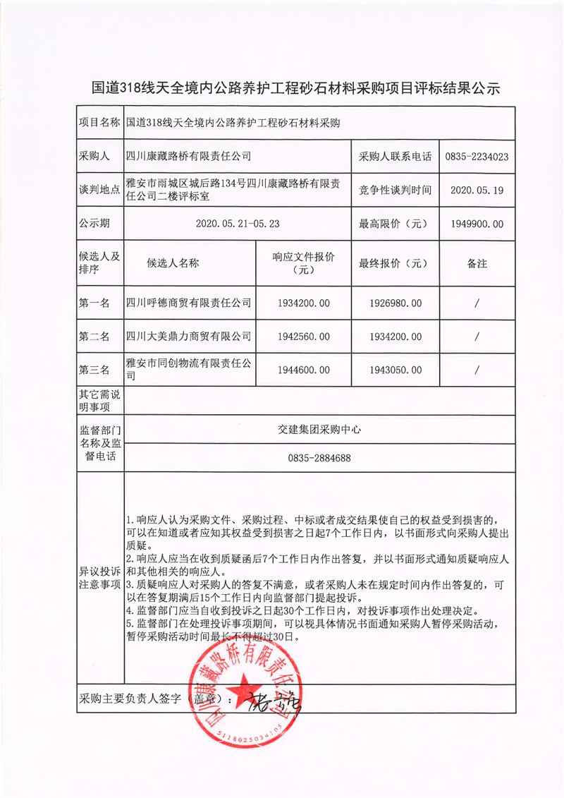四川康藏路橋有限責任公司國道318線天全境內(nèi)公路養(yǎng)護工程砂石材料采購項目評標結(jié)果公示