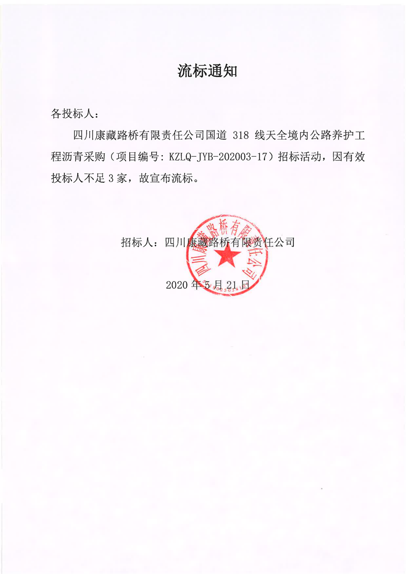四川康藏路橋有限責任公司國道318線天全境內公路養(yǎng)護工程瀝青采購項目流標通知