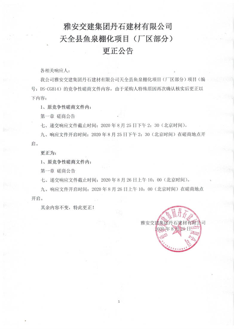 雅安交建集團(tuán)丹石建材有限公司天全縣魚泉棚化項目(廠區(qū)部分)更正公告