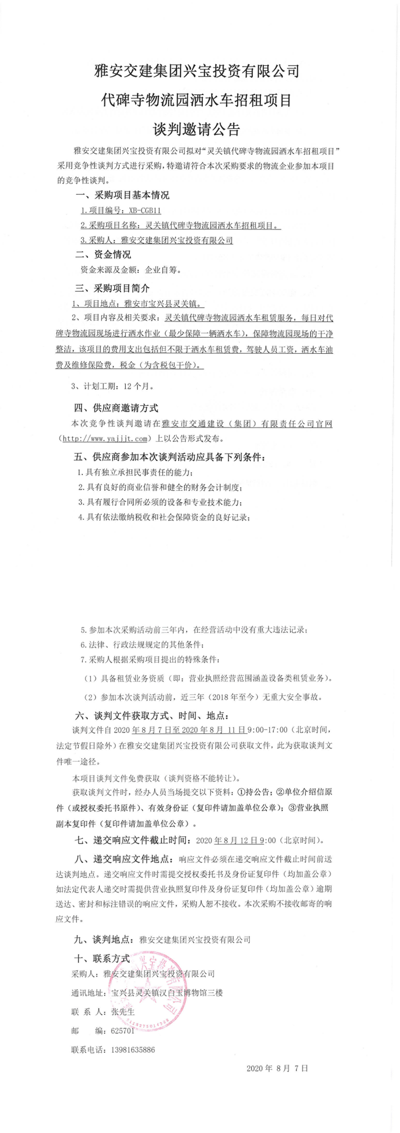 雅安交建集團興寶投資有限公司代碑寺物流園灑水車招租項目談判邀請公告