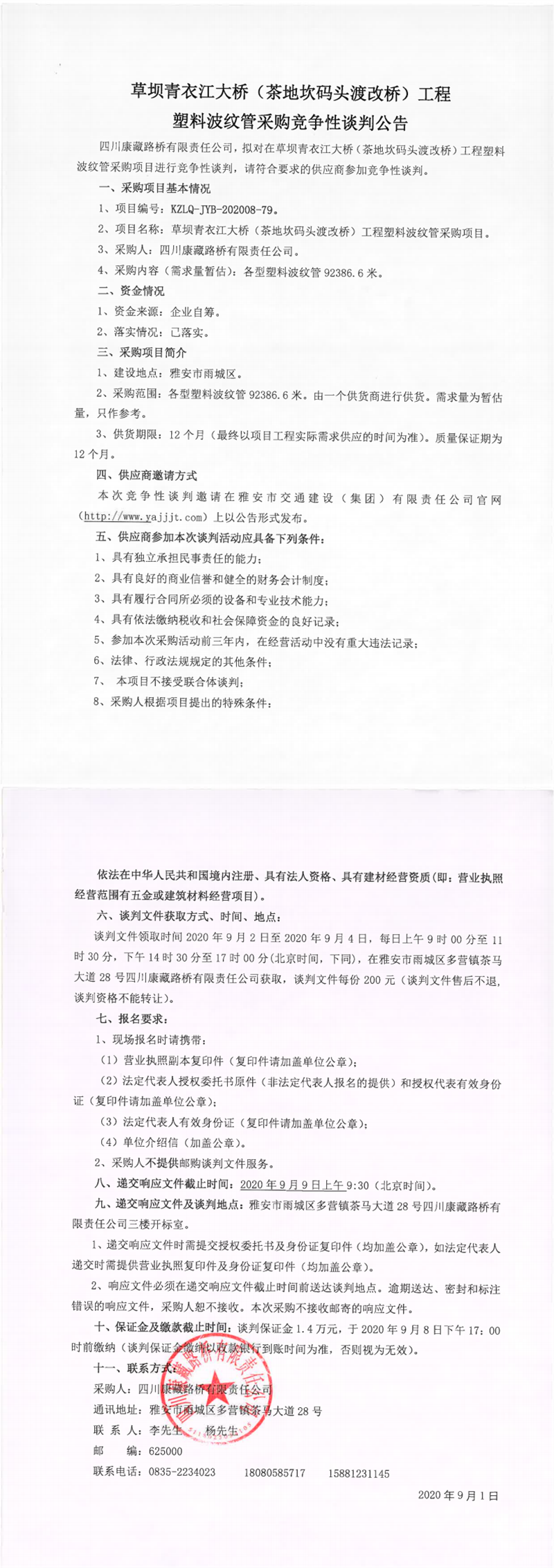 四川康藏路橋有限責(zé)任公司草壩青衣江大橋(茶地坎碼頭渡改橋)工程塑料波紋管采購競爭性談判公告