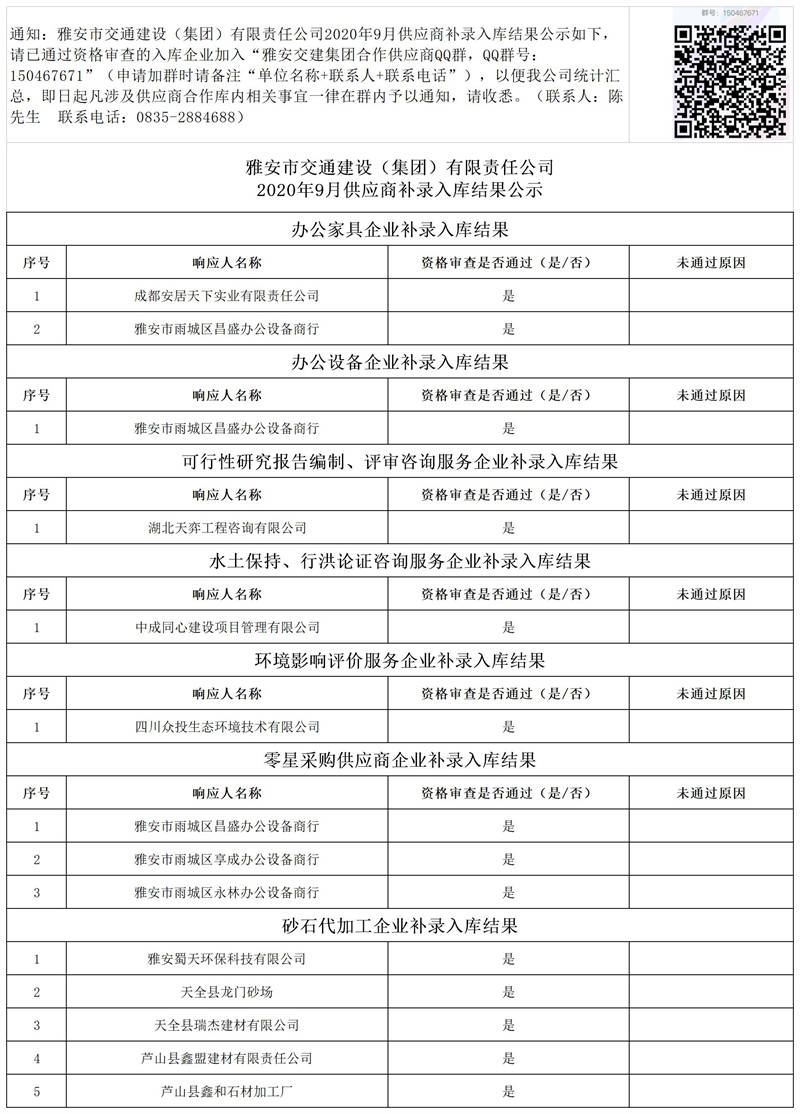 雅安市交通建設(shè)(集團)有限責任公司2020年9月供應(yīng)商補錄入庫結(jié)果公示