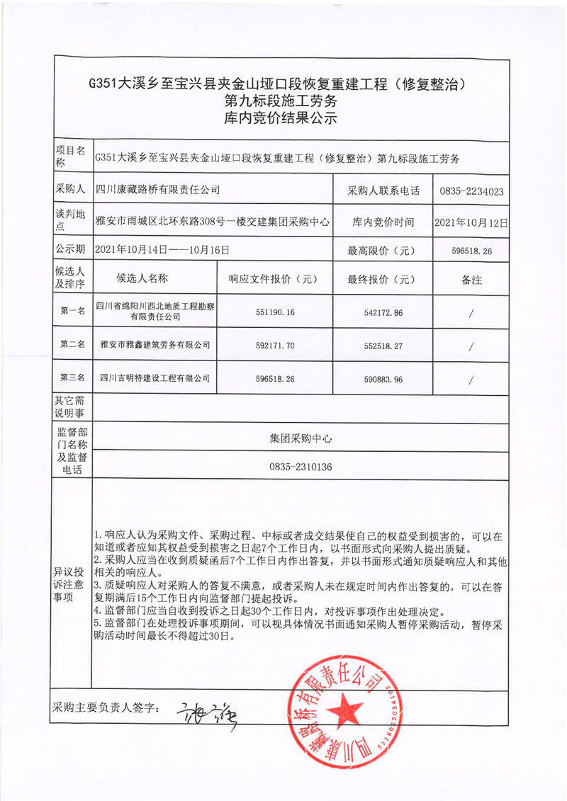 四川康藏路橋有限責(zé)任公司G351大溪鄉(xiāng)至寶興縣夾金山埡口段恢復(fù)重建工程(修復(fù)整治)第九標段施工勞務(wù)庫內(nèi)競價結(jié)果公示