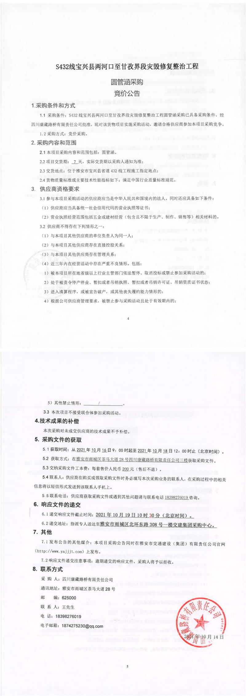 四川康藏路橋有限責任公司S432線寶興縣兩河口至甘孜界段災毀修復整治工程圓管涵采購競價公告