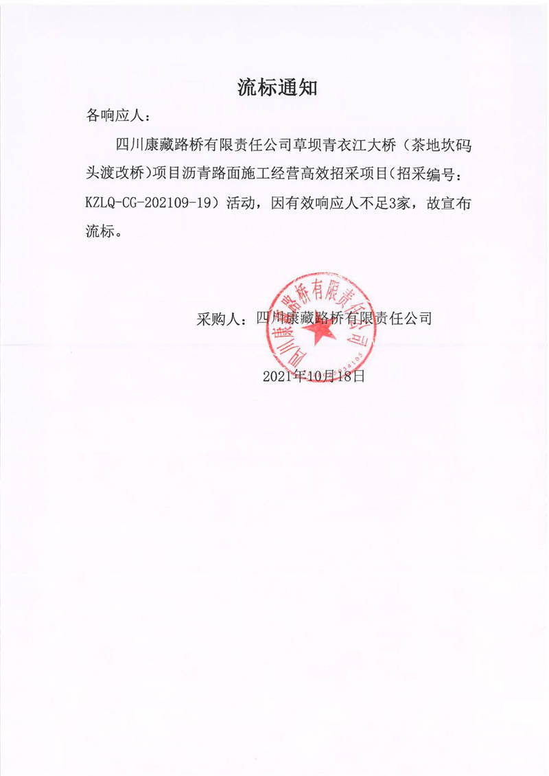 四川康藏路橋有限責任公司草壩青衣江大橋(茶地坎碼頭渡改橋)項目瀝青路面施工經營高效招采項目流標通知