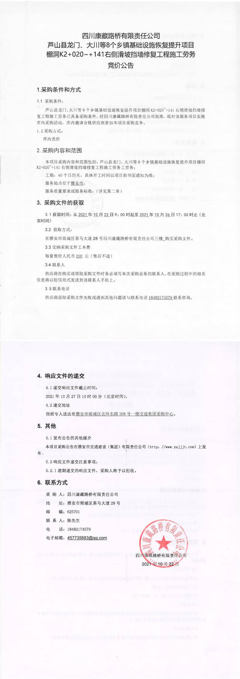 四川康藏路橋有限責任公司蘆山縣龍門、大川等8個鄉(xiāng)鎮(zhèn)基礎(chǔ)設(shè)施恢復提升項目棚洞K2+020~+141右側(cè)滑坡?lián)鯄π迯凸こ淌┕趧?wù)采購競價公告