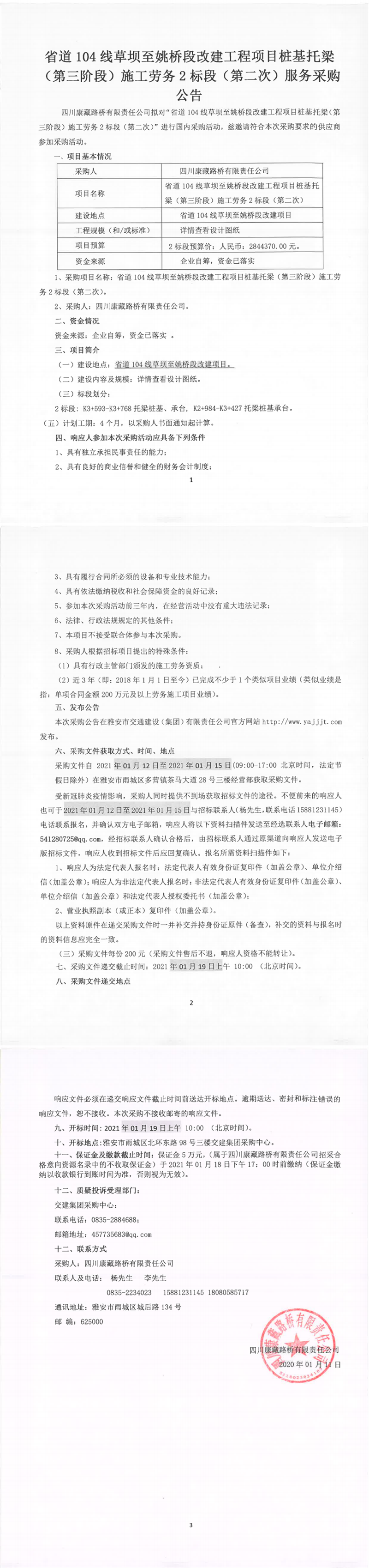 四川康藏路橋有限公司省道104線草壩至姚橋段改建工程項(xiàng)目樁基托梁(第三階段)施工勞務(wù)2標(biāo)段(第二次)服務(wù)采購公告