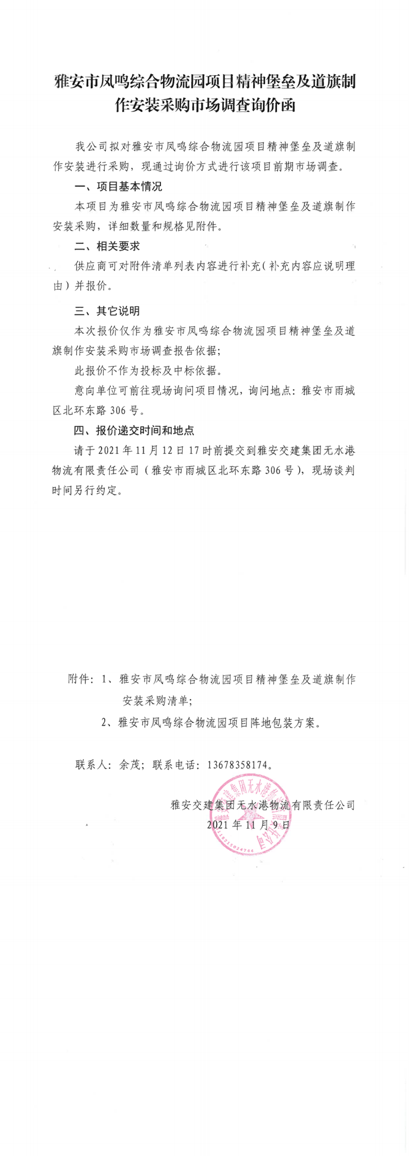 雅安交建集團(tuán)無水港物流有限責(zé)任公司雅安市鳳鳴綜合物流園項(xiàng)目精神堡壘及道旗制作安裝采購市場(chǎng)調(diào)查詢價(jià)函
