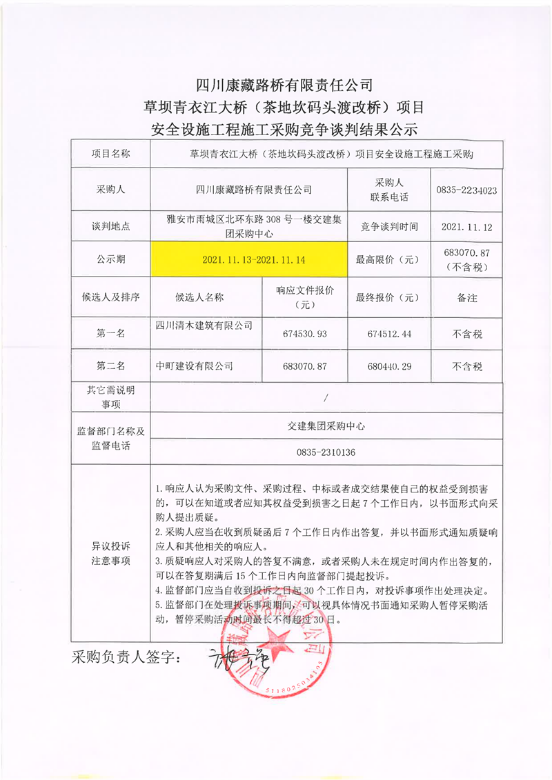 四川康藏路橋有限責(zé)任公司草壩青衣江大橋(茶地坎碼頭渡改橋)項(xiàng)目安全設(shè)施施工采購競(jìng)爭談判結(jié)果公示