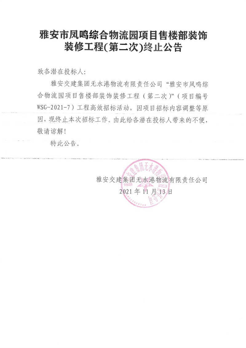 雅安交建集團無水港物流有限責任公司雅安市鳳鳴綜合物流園項目售樓部裝飾裝修工程(第二次)終止公告