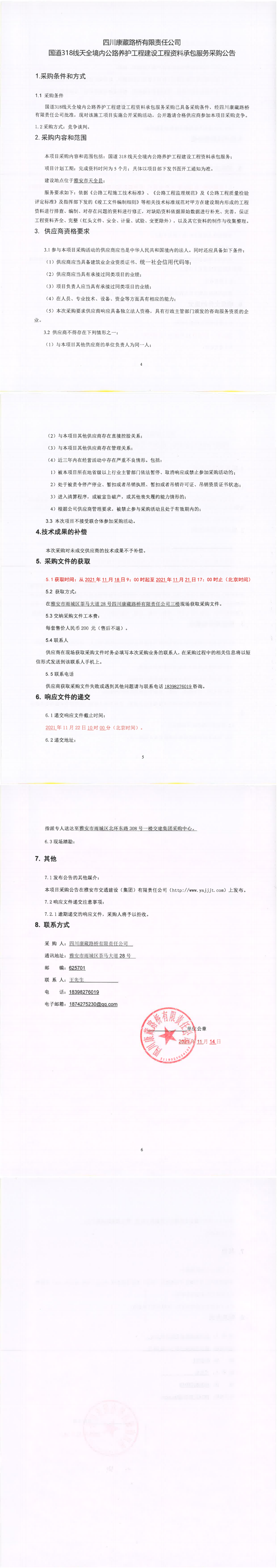 四川康藏路橋有限責(zé)任公司國(guó)道318線天全境內(nèi)公路養(yǎng)護(hù)工程建設(shè)工程資料承包服務(wù)采購(gòu)公告