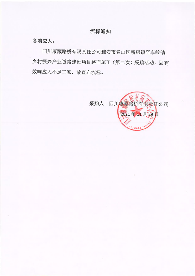 四川康藏路橋有限責(zé)任公司雅安市名山區(qū)新店鎮(zhèn)至車嶺鎮(zhèn)鄉(xiāng)村振興產(chǎn)業(yè)道路建設(shè)項目路面施工(第二次)流標通知
