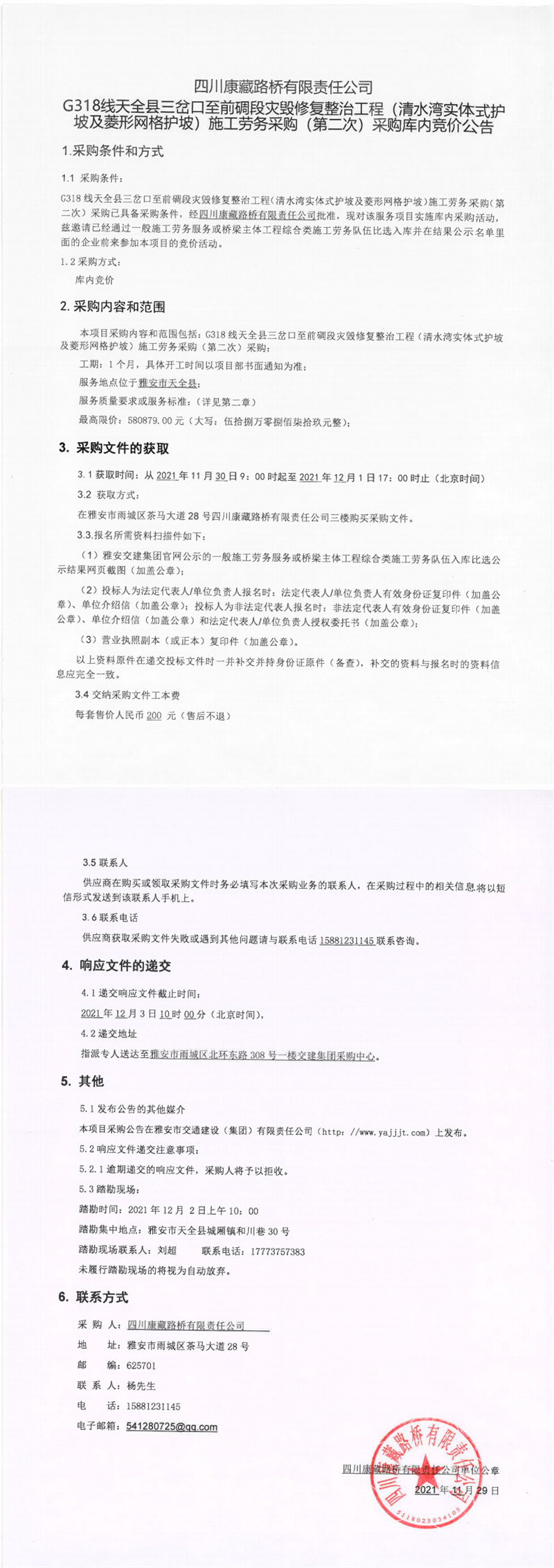 四川康藏路橋有限責任公司G318線天全縣三岔口至前碉段災毀修復整治工程(清水灣實體式護坡及菱形網護坡)施工勞務采購(第二次)采購庫內競價公告