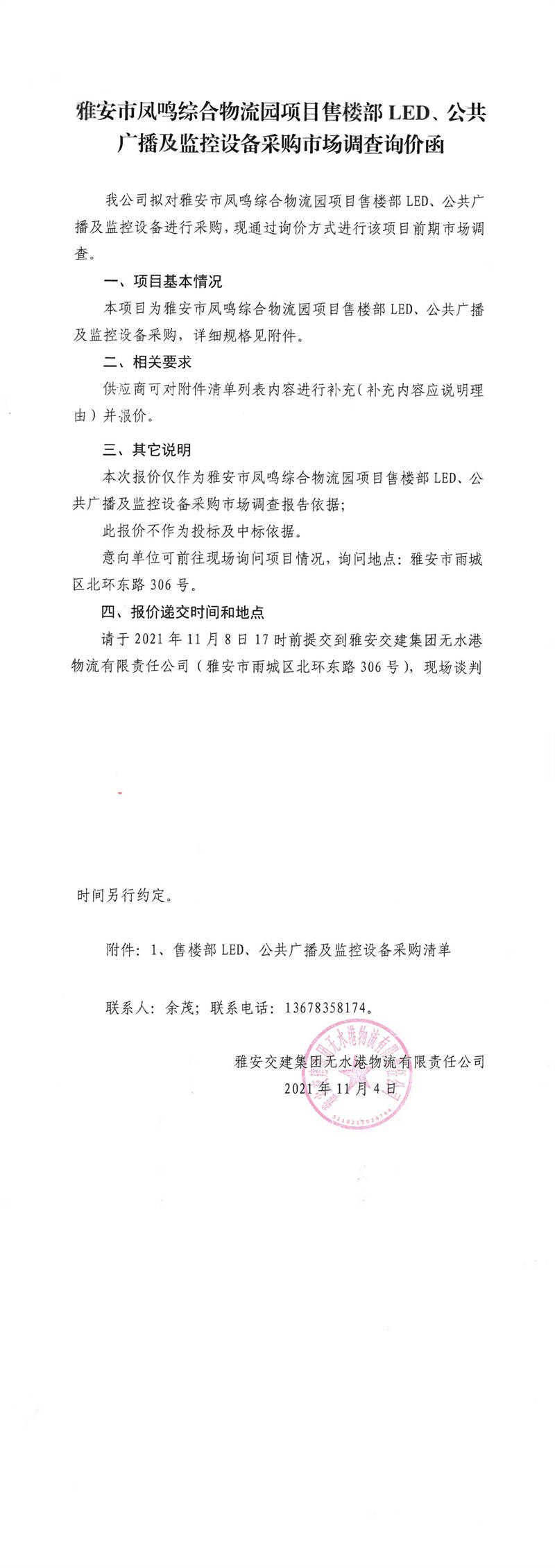 雅安交建集團無水港物流有限責任公司雅安市鳳鳴綜合物流園項目售樓部LED、公共廣播及監(jiān)控設(shè)備采購市場調(diào)查詢價函