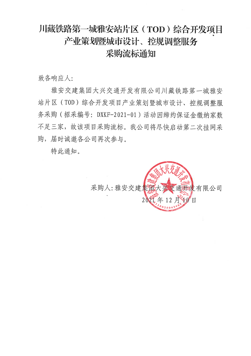 雅安交建集團大興交通開發(fā)有限公司川藏鐵路第一城雅安站片區(qū)(TOD)綜合開發(fā)項目產(chǎn)業(yè)策劃暨城市設(shè)計、控規(guī)調(diào)整服務(wù)采購流標通知