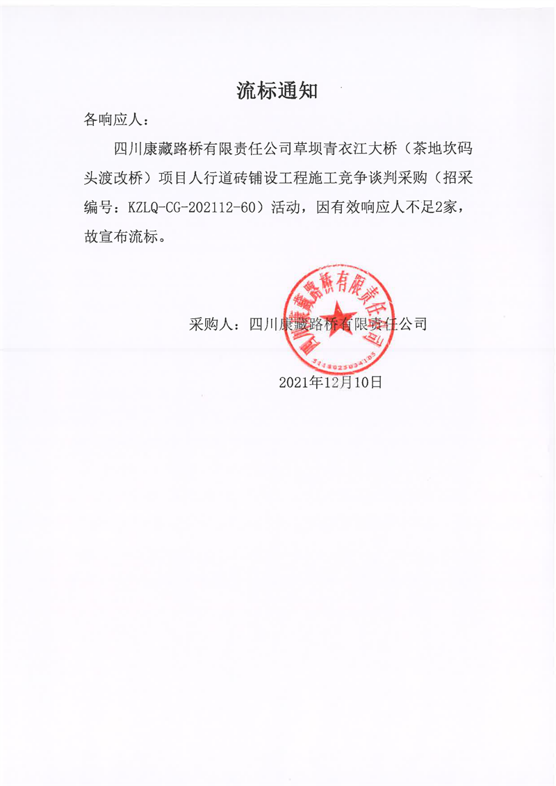 四川康藏路橋有限責(zé)任公司草壩青衣江大橋(茶地坎碼頭渡改橋)項目人行道磚鋪設(shè)工程施工競爭談判采購流標(biāo)通知