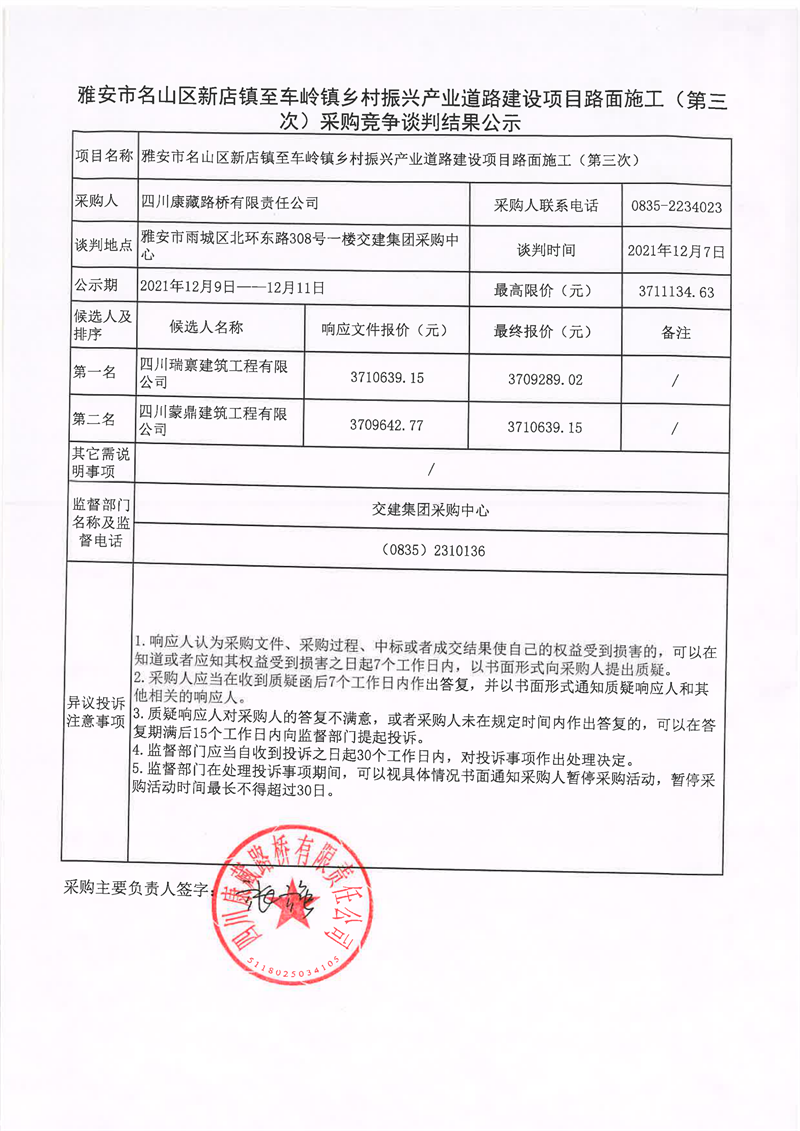 四川康藏路橋有限責任公司雅安市名山區(qū)新店鎮(zhèn)至車嶺鎮(zhèn)鄉(xiāng)村振興產(chǎn)業(yè)道路建設項目路面施工(第三次)采購競爭談判結(jié)果公示