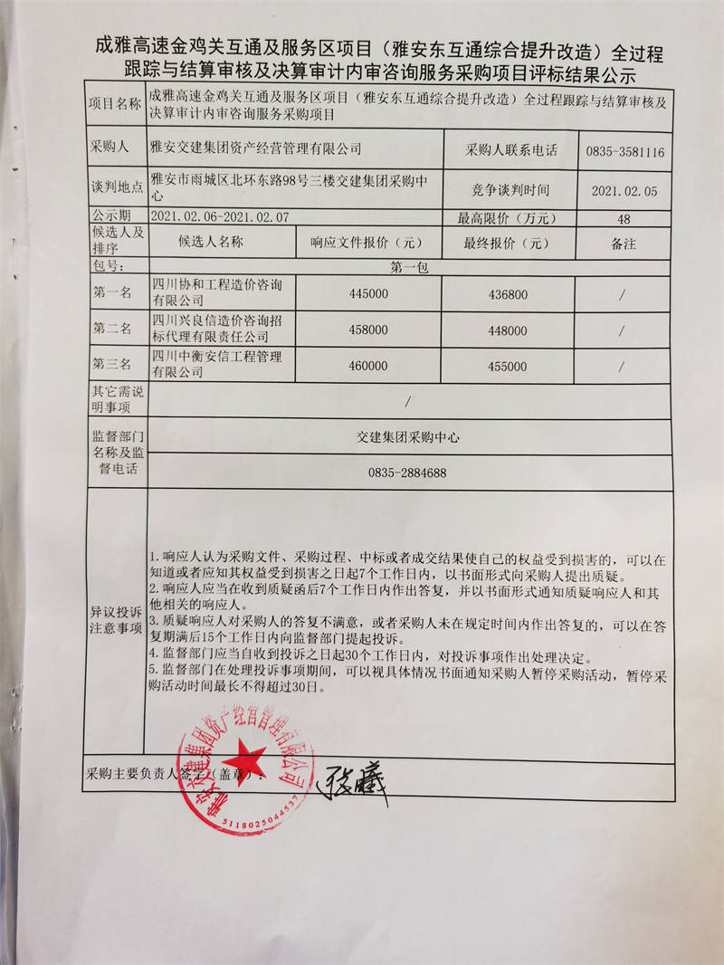 雅安交建集團(tuán)資產(chǎn)經(jīng)營管理有限公司成雅高速金雞關(guān)互通及服務(wù)區(qū)項目(雅安東互通綜合提升改造)全過程跟蹤與結(jié)算審核及決算審計內(nèi)審咨詢服務(wù)評標(biāo)結(jié)果公示