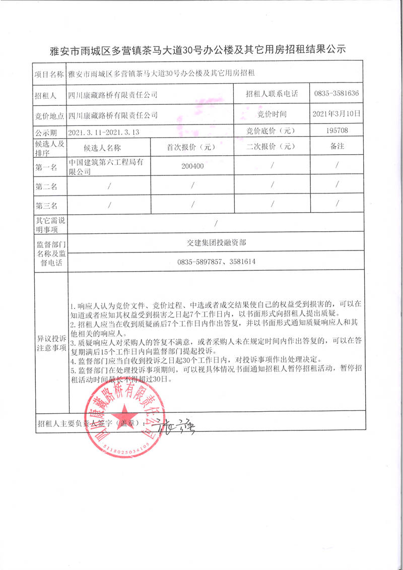 四川康藏路橋有限責任公司雅安市雨城區(qū)多營鎮(zhèn)茶馬大道30號辦公樓及其它用房招租結(jié)果公示